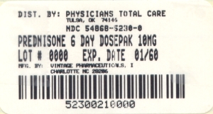 This is a package of Prednisone 6 Day Dosepak, distributed by Physicians Total Care. It contains 21 tablets and has a LOT# of 0600 with an expiration date of 01/60. There is some unreadable text and characters, including an NDC code.*