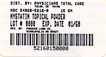 This is a description of a medicine product called "Nystatin topical powder" with an NDC (National Drug Code) number of 54868-5216-0, which is distributed by Physicians Total Care. The product comes in a 15-gram container and has an expiration date of 01/60.*