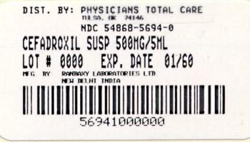 The following 3 images provide visual information about the product associated with Cefadroxil NDC 54868-5694 by Physicians Total Care, Inc., such as packaging, labeling, and the appearance of the drug itself. This resource could be helpful for medical professionals, pharmacists, and patients seeking to verify medication information and ensure they have the correct product.