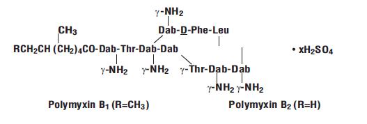Polymyxin B for Injection USP is one of a group of basic polypeptide antibiotics derived from B polymyxa (B aerosporous). Polymyxin B sulfate is the sulfate salt of Polymyxins B1 and B2, which are produced by the growth of Bacillus polymyxa (Prazmowski) Migula (Fam. Bacillacea). Polymyxin B sulfate USP is a white or off-white powder. It has a potency of not less than 6,000 polymyxin B units per mg, calculated on the anhydrous basis. The structural formulae are:
