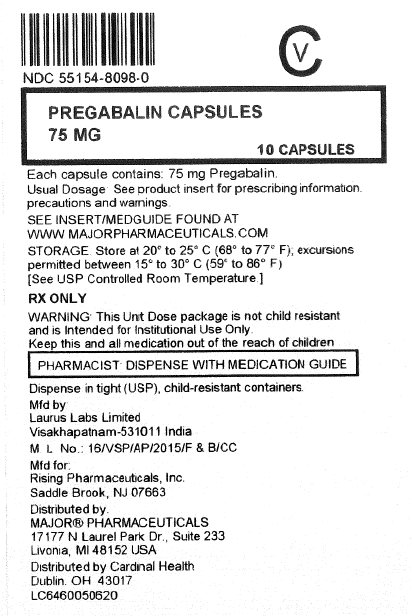 This is a description of a medication with the NDC code 55154-8097-0. It is a 50mg Pregabalin capsule, and each package contains 10 capsules. The usual dosage information is present on the product insert. The medication should be stored at room temperature, and away from children. The medication is dispensed in child-resistant containers by pharmacist with a medication guide. The manufacturer of the medication is Laurus Labs Limited and distributed by Major Pharmaceutical which is distributed by Cardinal Health. The text does not provide any indication for what this medication is used for.*