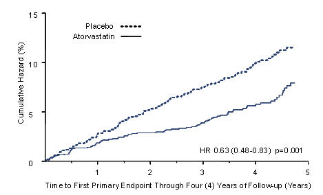 This is a graph displaying the cumulative hazard in percentage over a period of four years for Atorvastatin. The graph also shows a Hazard Ratio (HR) of 0.53 for the Atorvastatin treatment.*
