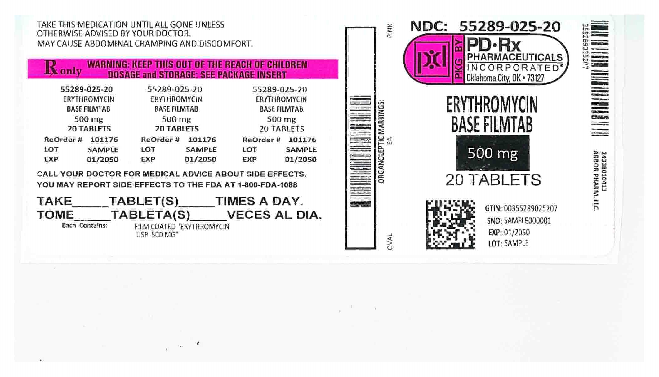 This is a description of a medication called Erythromycin. The medication comes in 500mg strength tablets in a pack of 20, with NDC code 55289-025-20. The medication is pink in color and produced by PD-Rx Pharmaceuticals Incorporated in Oklahoma City. The medication is taken orally, and the patient should continue usage until the medication is completely finished, unless instructed otherwise by their doctor. Erythromycin may cause abdominal discomfort and cramps. In the case of side effects, patients are advised to contact their medical provider or report to the FDA. The medication details, such as the lot, the expiration date and the dosage instructions, are also mentioned.*