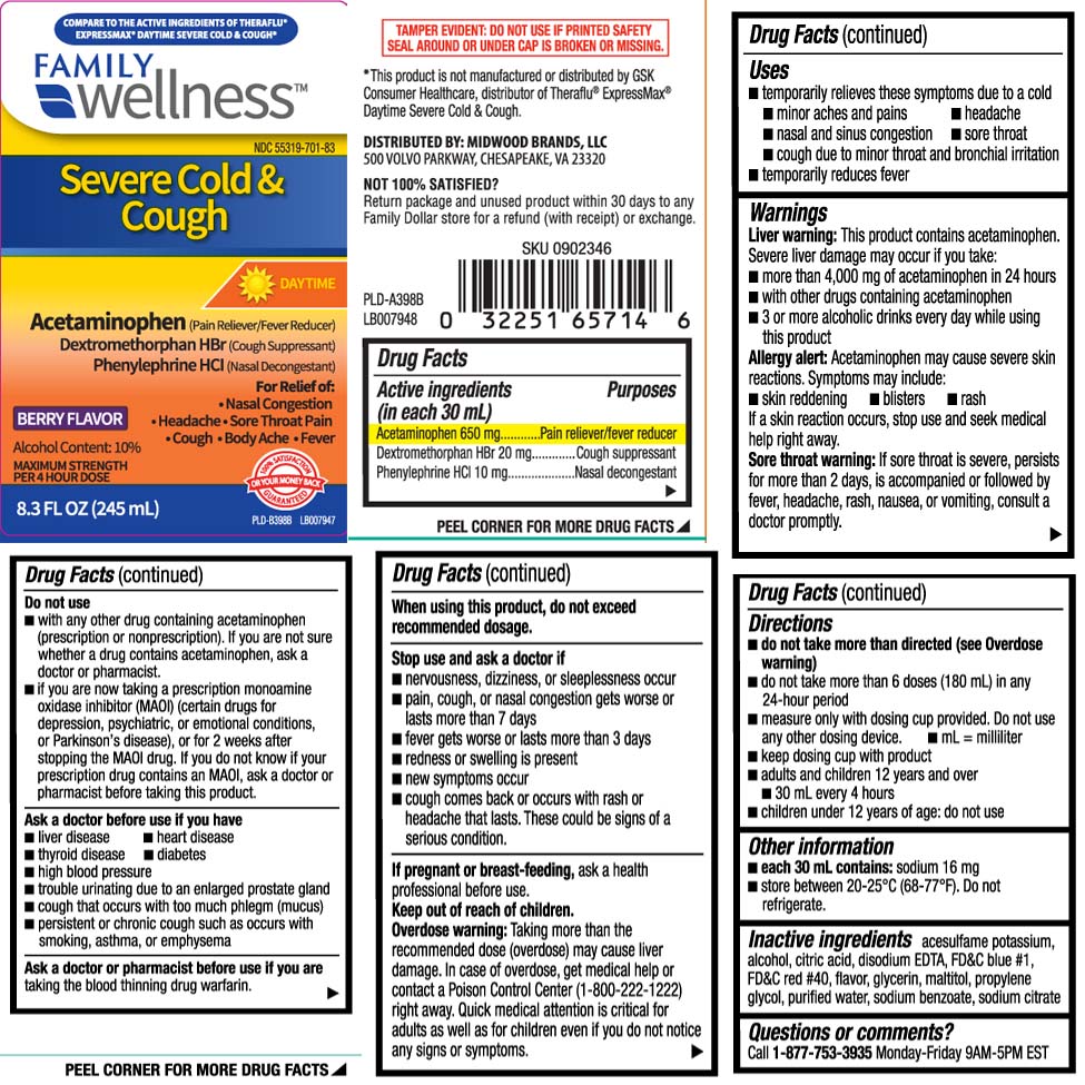The following image provide visual information about the product associated with Severe Cold And Cough Relief Daytime NDC 55319-701 by Family Dollar (family Wellness), such as packaging, labeling, and the appearance of the drug itself. This resource could be helpful for medical professionals, pharmacists, and patients seeking to verify medication information and ensure they have the correct product.