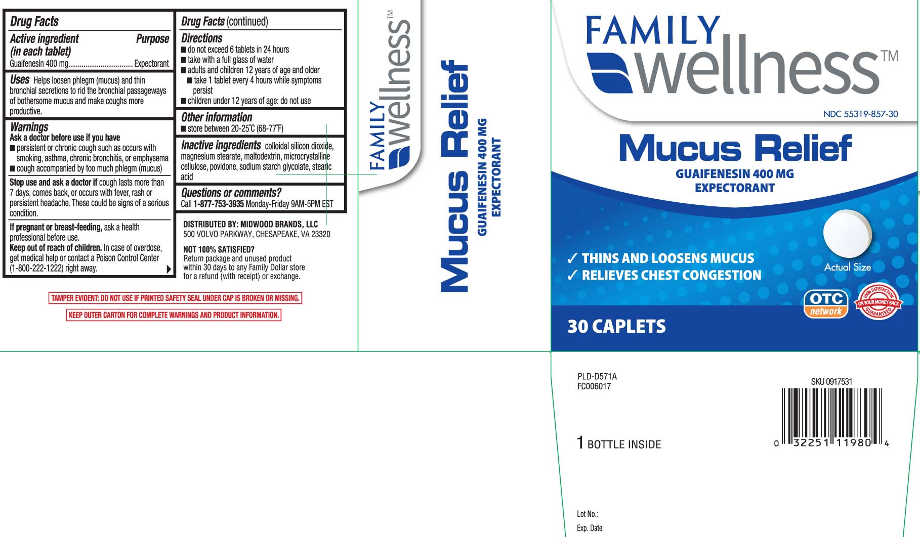 The following image provide visual information about the product associated with Mucus Relief NDC 55319-857 by Family Dollar (family Wellness), such as packaging, labeling, and the appearance of the drug itself. This resource could be helpful for medical professionals, pharmacists, and patients seeking to verify medication information and ensure they have the correct product.