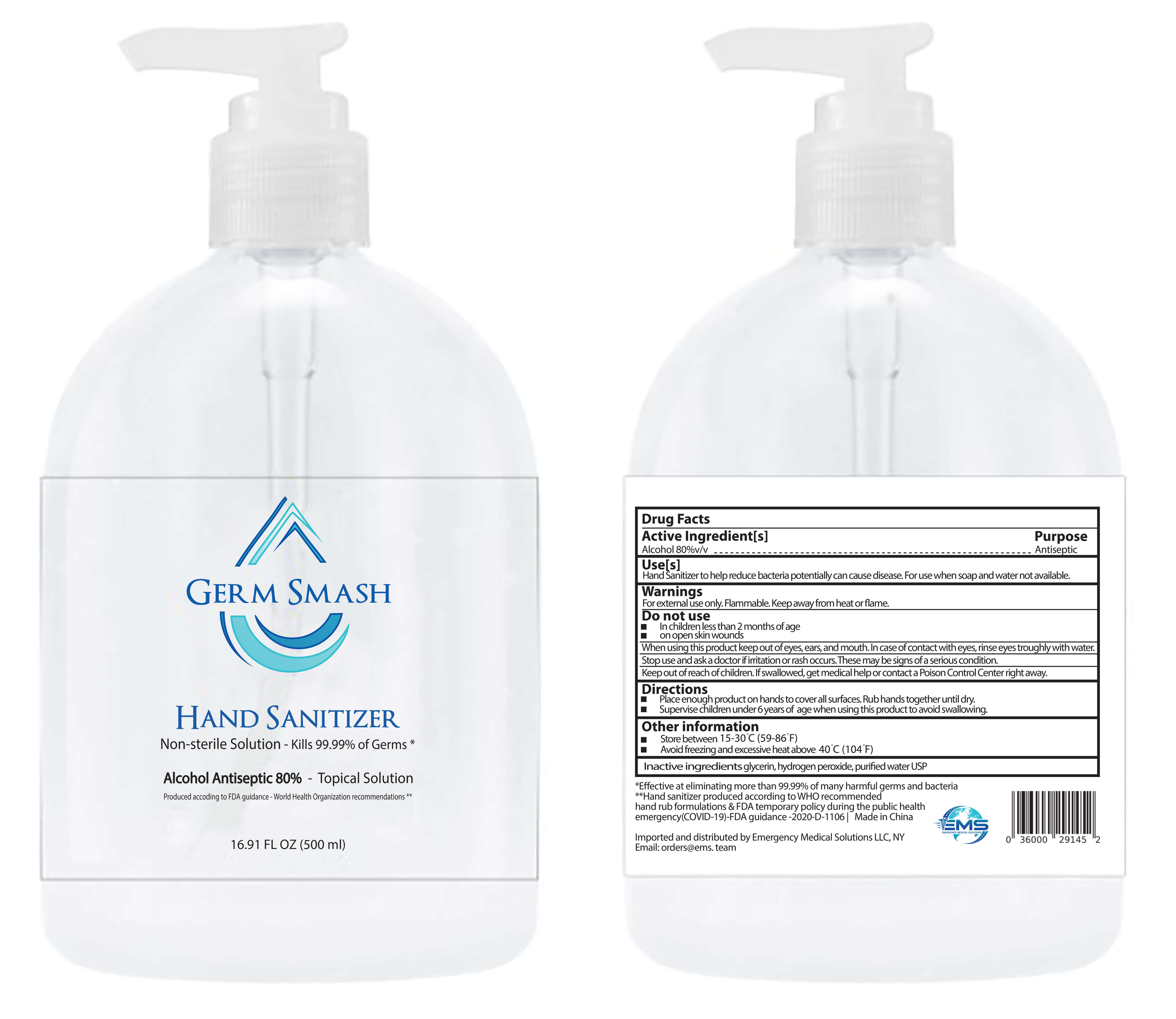 This is a drug facts label for a hand sanitizer that contains 80% alcohol as an antiseptic to help reduce bacteria that can potentially cause disease. It is recommended for use when soap and water are not available. The label includes warnings to keep the hand sanitizer away from heat or flame and to not use it on open wounds or on children under 2 months of age. The directions indicate that enough product should be used to cover all surfaces of the hands and rubbed together until dry. This hand sanitizer is produced according to FDA guidance and WHO recommendations and distributed by Emergency Medical Solutions LLC.*