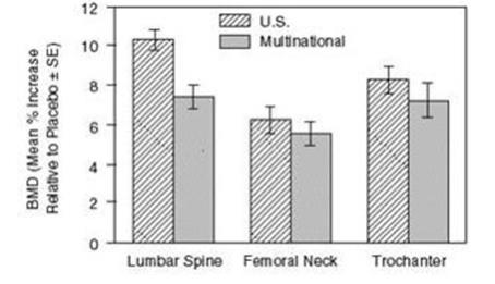 This appears to be a table with headings for mean percent change from baseline bone mineral density (BMD) measurements, specifically for alendronate sodium 10mg in a multinational study. No further information is available.*