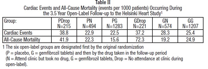 This is a statistical table reporting the number of cardiac events and all-cause mortality per 1000 patients in different treatment groups during a 3.5 year follow-up study called the Helsinki Heart Study. The groups are labeled as PDrop, PN, PG, GDrop, GN, and GG, based on their original randomization and whether or not they attended clinics and took medication during the open-label follow-up period. The table shows the number of events and mortality rates for each group, with N representing the total number of patients in each group.*