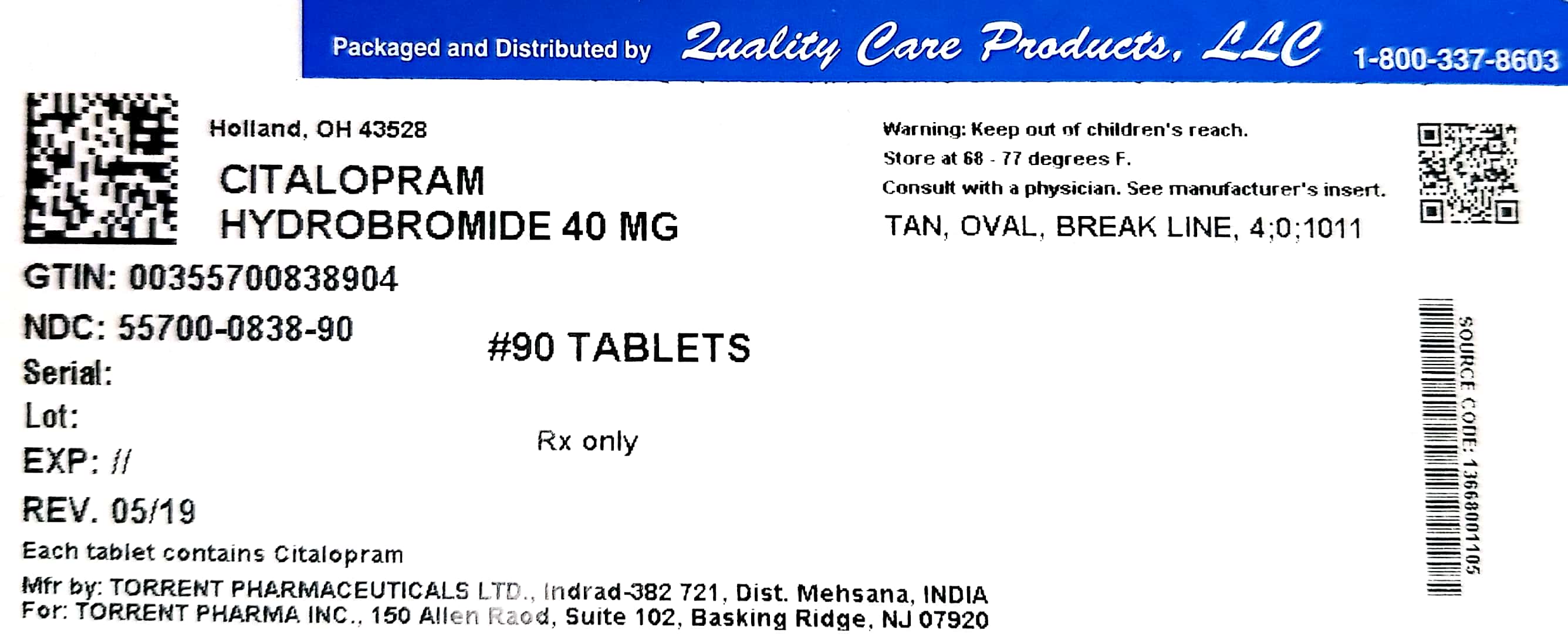 The following 4 images provide visual information about the product associated with Citalopram Hydrobromide NDC 55700-838 by Quality Care Products, Llc, such as packaging, labeling, and the appearance of the drug itself. This resource could be helpful for medical professionals, pharmacists, and patients seeking to verify medication information and ensure they have the correct product.