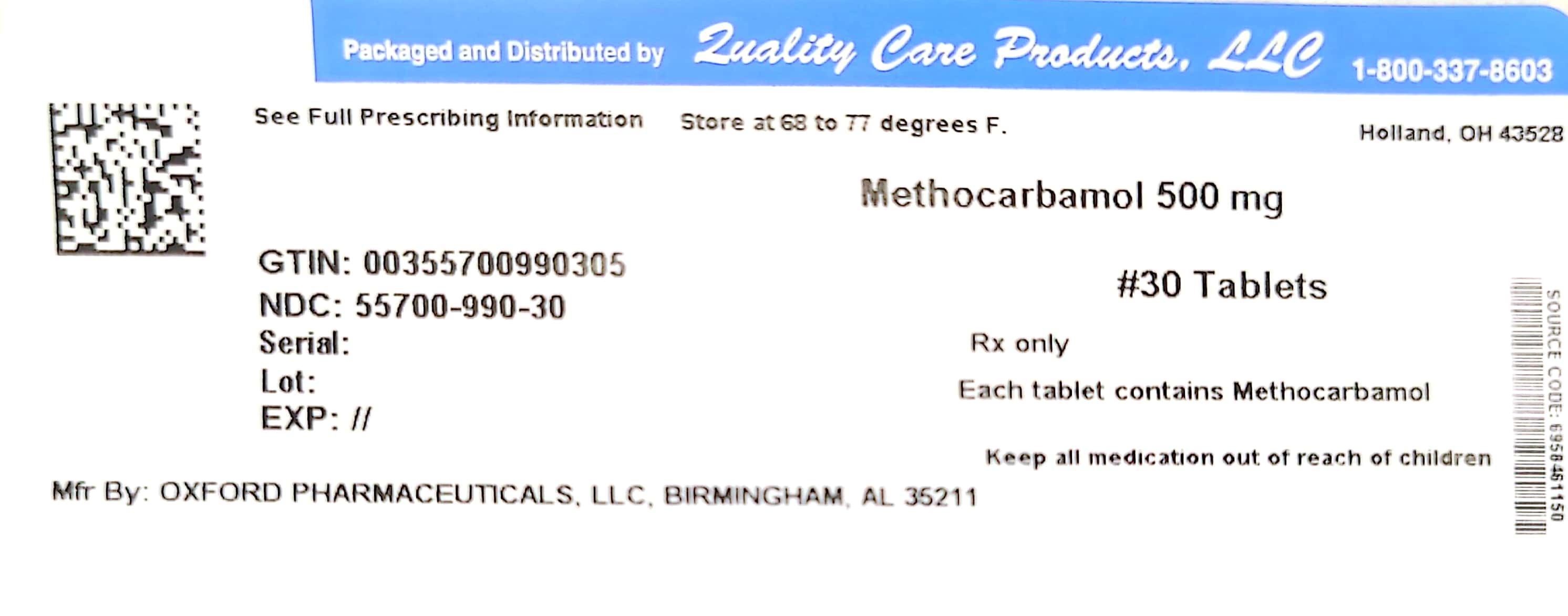 The following 2 images provide visual information about the product associated with Methocarbamol NDC 55700-990 by Quality Care Products, Llc, such as packaging, labeling, and the appearance of the drug itself. This resource could be helpful for medical professionals, pharmacists, and patients seeking to verify medication information and ensure they have the correct product.