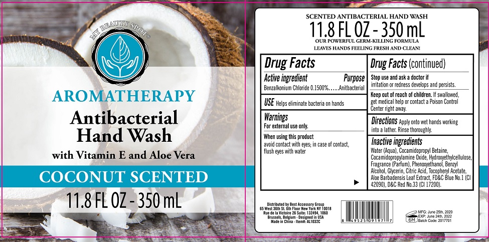The following image provide visual information about the product associated with My Beauty Spot Aromatherapy Antibacterial Hand Wash With Vitamin E And Aloe Vera (coconut Scented) NDC 56136-315 by Ganzhou Olivee Cosmetic Co., Ltd., such as packaging, labeling, and the appearance of the drug itself. This resource could be helpful for medical professionals, pharmacists, and patients seeking to verify medication information and ensure they have the correct product.