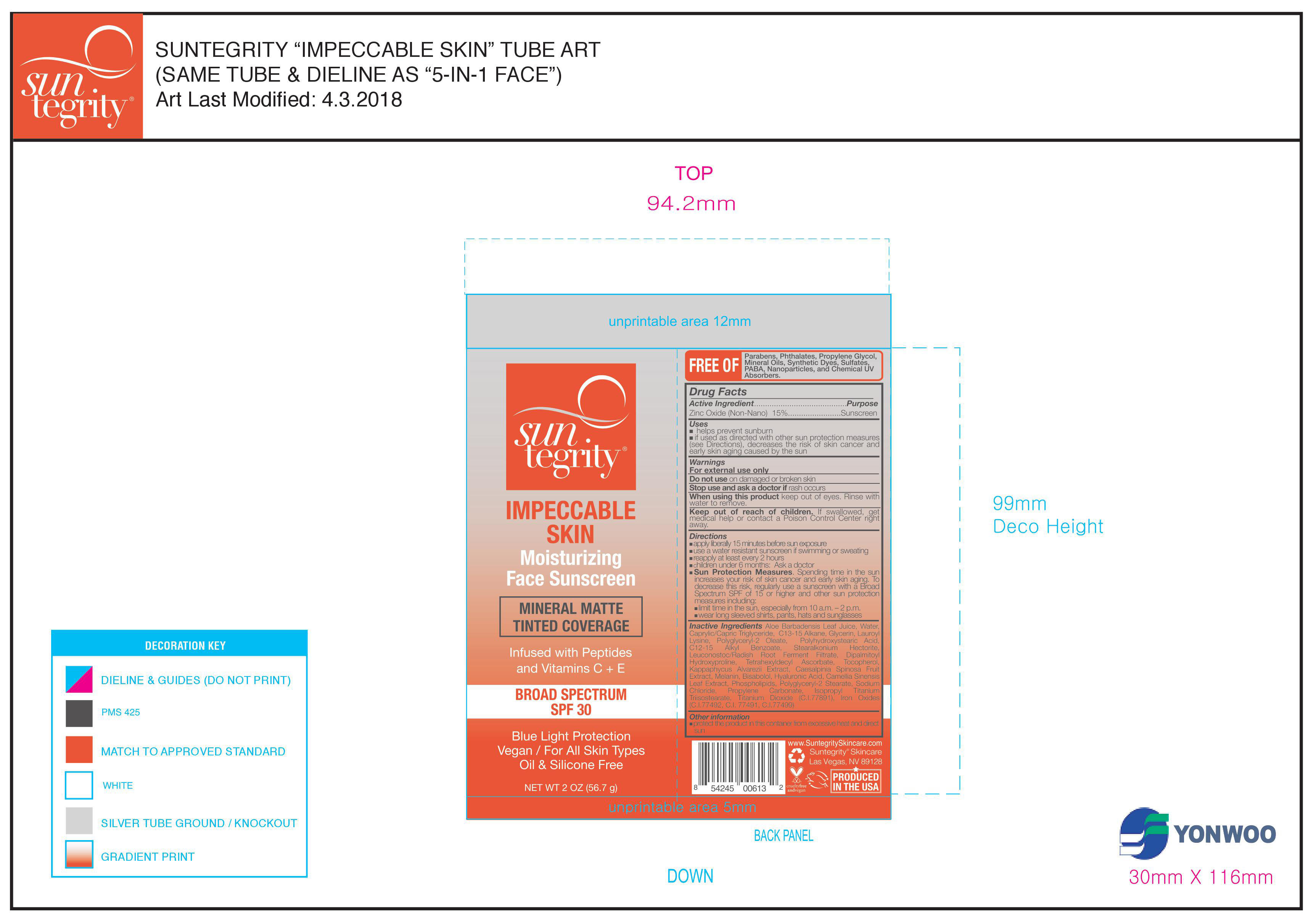 The text is a product description for SUNTEGRITY "IMPECCABLE SKIN" sunscreen in a silver tube. The sunscreen is free of parabens, phthalates, propylene glycol, mineral oils, synthetic dyes, sulfates, PABA, nanoparticles, and chemical UV absorbers. The active ingredient is Zinc Oxide (Non-Nano) 15 which helps prevent sunburn and decreases the risk of skin cancer and early skin aging caused by the sun. The sunscreen is suitable for all skin types, vegan, oil and silicone-free, and provides broad-spectrum coverage with SPF 30. The description includes drug facts, warnings, and directions for use. There is also a dieline and guide provided, and the back panel has a gradient print.*
