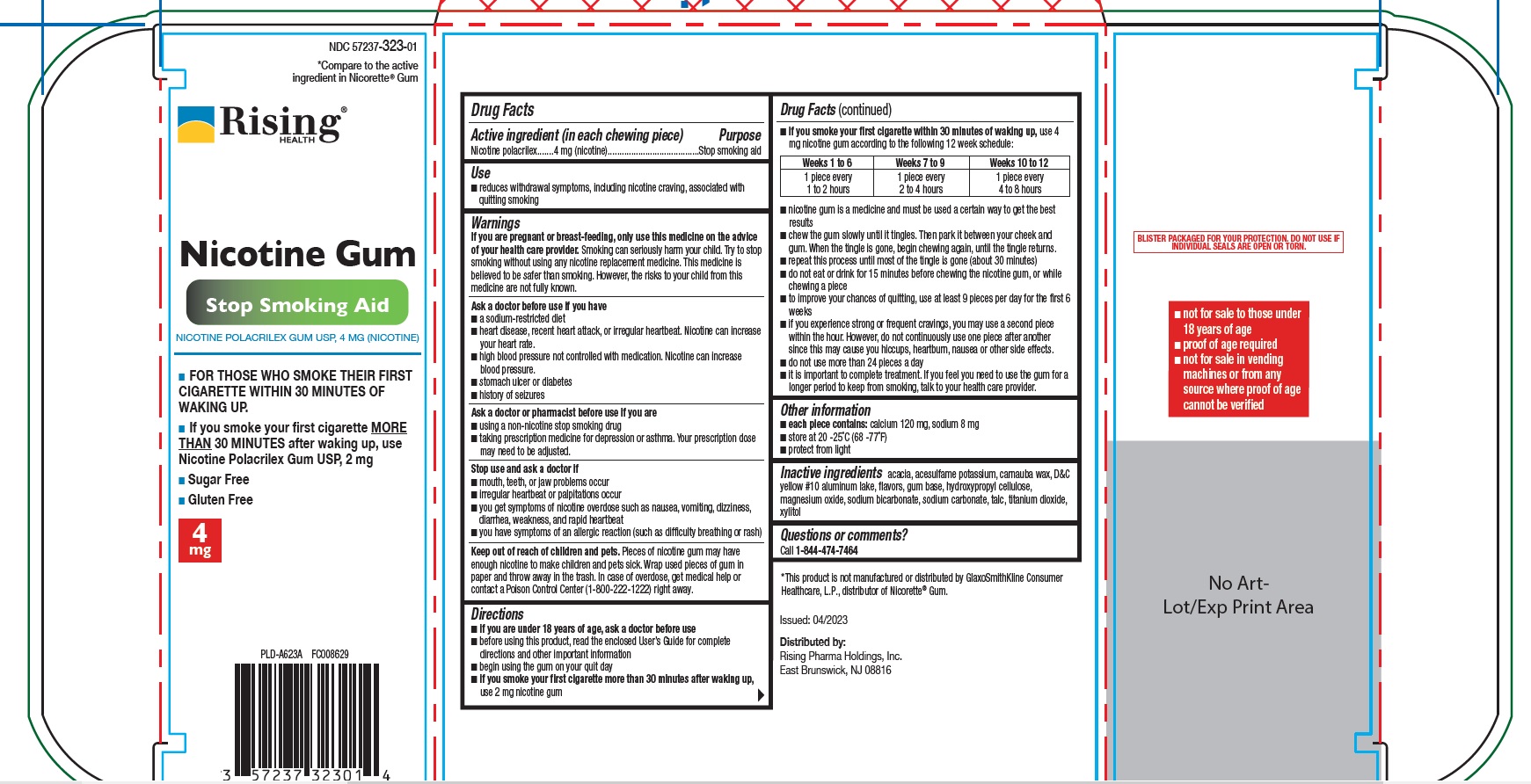 The following 2 images provide visual information about the product associated with Nicotine Polacrilex NDC 57237-323 by Rising Pharma Holdings, Inc., such as packaging, labeling, and the appearance of the drug itself. This resource could be helpful for medical professionals, pharmacists, and patients seeking to verify medication information and ensure they have the correct product.