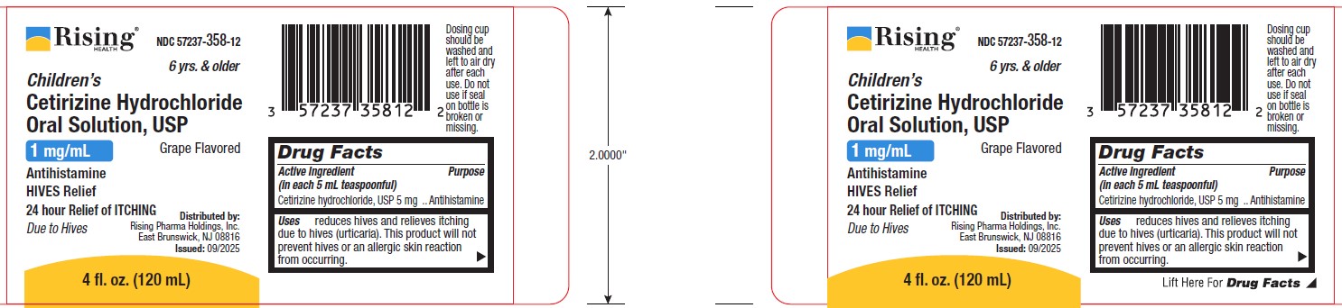 The following 6 images provide visual information about the product associated with Cetirizine Hydrochloride NDC 57237-358 by Rising Pharma Holdings, Inc., such as packaging, labeling, and the appearance of the drug itself. This resource could be helpful for medical professionals, pharmacists, and patients seeking to verify medication information and ensure they have the correct product.