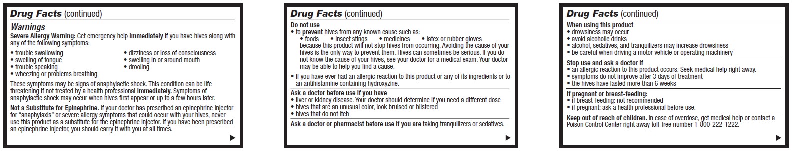 This is a detailed drug fact sheet providing information on warnings, precautions, and instructions for the use of a medication for treating hives and severe allergies. It includes warnings for severe allergic reactions, information on not using the product as a substitute for epinephrine, details on when not to use the medication, guidance on potential side effects like drowsiness, and advice on seeking medical help if certain symptoms persist. Additionally, the text highlights the importance of consulting a doctor before using the product in case of certain conditions like liver or kidney disease, unusual hives, or if taking tranquilizers or sedatives. Pregnant and breastfeeding individuals are advised to consult a healthcare professional before using the medication. Lastly, there are instructions on keeping the product out of reach of children and what to do in case of an overdose.*
