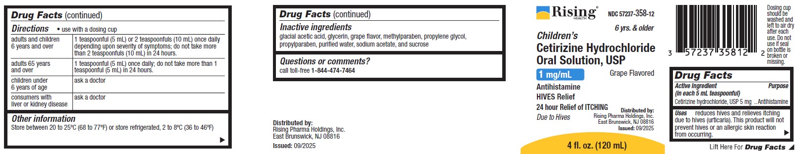 This text provides drug information for Cetirizine Hydrochloride Oral Solution, a grape-flavored antihistamine used for hives relief. The recommended dosage for adults and children over 6 years old is 1-2 teaspoonfuls once daily, based on symptom severity. Adults over 65 years should take 1 teaspoonful daily. Children under 6 years old should consult a doctor before use. It also includes storage instructions, inactive ingredients list, and contact information for Rising Pharma Holdings, Inc. The active ingredient in this solution is Cetirizine hydrochloride, 5mg per 5mL teaspoonful. This product is designed to reduce hives and relieve itching caused by hives but does not prevent hives or allergic skin reactions.*