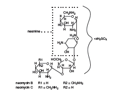 Neomycin sulfate is the sulfate salt of neomycin B and C, which are produced by the growth of Streptomyces fradiae Waksman (Fam. Streptomycetaceae). It has a potency equivalent of not less than 600 micrograms of neomycin standard per milligram, calculated on an anhydrous basis. The structural formulae are: