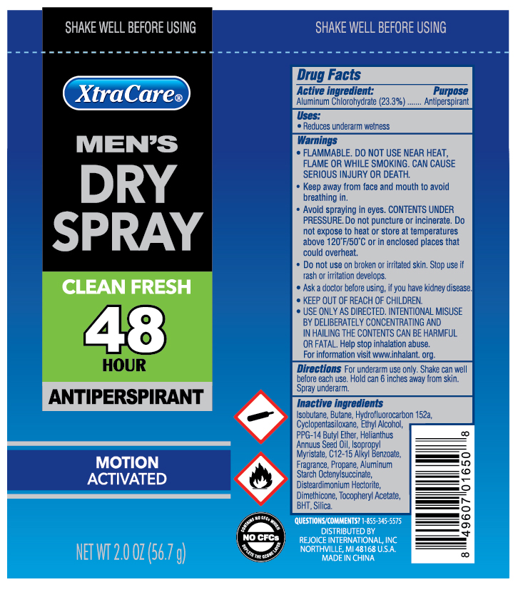 This is a men's antiperspirant which should be shaken well before using. The can contains 2007 net weight units and the spray is motion activated. The product should not be used near sources of heat, open flames, or while smoking. The product should be kept away from the face and mouth to avoid inhalation, and shouldn't be sprayed in the eyes. It shouldn't be punctured, exposed to heat or stored above 120°F or in enclosed places that could overheat. This product is intended for underarm use only and contains 23.3% Aluminum Chiorohydrate as an active ingredient. The product contains isobutane, butane, hydrofluorocarbon 1522, cyclopentasiloxane, ethyl alcohol, PPG-14 butyl Ele, hollnthus, amnaus S O, isopropyl myristate, C12-15 alkyl benzoate, and fragrance as inactive ingredients. This product should not be used on broken or irritated skin, and use should be stopped if a rash or irritation develops. It should not be used by individuals with kidney disease, and should be kept out of reach of children. The intentional misuse by deliberately concentrating and inhaling the contents can be harmful or fatal. This product is made in China and is produced by Rejoice International, Inc.*