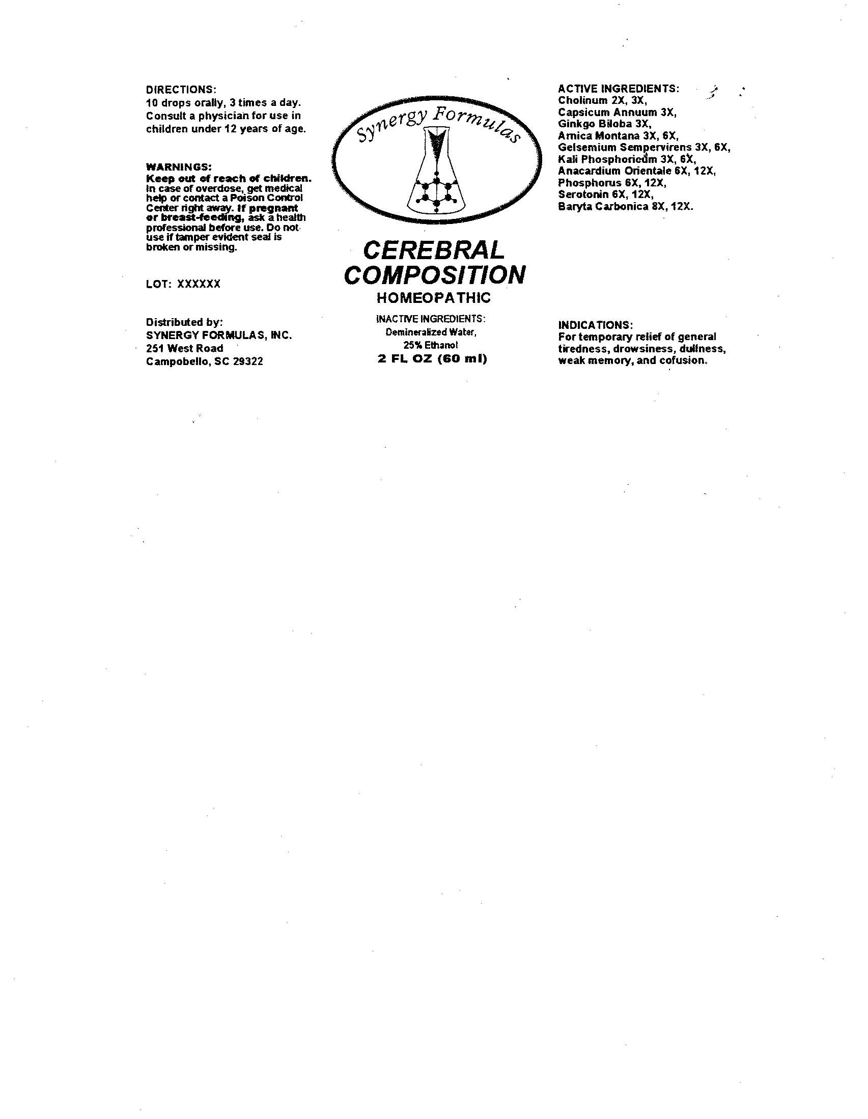 This is a description of a homeopathic formula called "Cerebral Composition" distributed by Synergy Formulas, Inc. The active ingredients of the formula include Cholinum, Capsicum Annuum, Ginkgo Biloba, Amica Montana, Gelsemium Sempervirens, Kali Phosphoricdm, Anacardium Orientale, Phosphorus, Serotonin, and Baryta Carbonica. The formula is intended for temporary relief of general tiredness, drowsiness, dullness, weak memory, and confusion. The recommended dosage is 10 drops orally, 3 times a day, but children under 12 should consult a physician before use. The formula should be kept out of reach of children, and in case of overdose, medical help or Poison Control should be contacted immediately.*