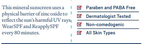 This product is a mineral sunscreen that uses physical barriers like zinc oxide to reflect the sun's harmful UV rays. It is paraben and PABA free, dermatologist tested, non-comedogenic, and suitable for all skin types. It is recommended to wear and reapply SPF every 50 minutes.*