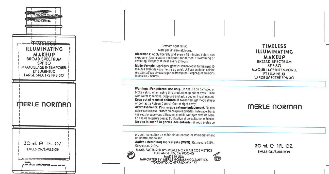 This text is a drug facts label with information on the active and inactive ingredients, usage, warnings, and directions for sunscreen use. The product is a timeless illuminating makeup with broad-spectrum SPF 30 from Merle Norman. It helps in preventing sunburn and reducing the risk of skin cancer and early skin aging when used as directed with other sun protection measures. The product contains Octinoxate and Oxybenzone as active (medicinal) ingredients. Besides, the label includes detailed instructions on the application of the product and the recommended protection measures against the sun. However, some parts of the text have characters that are not English, possibly due to errors.*