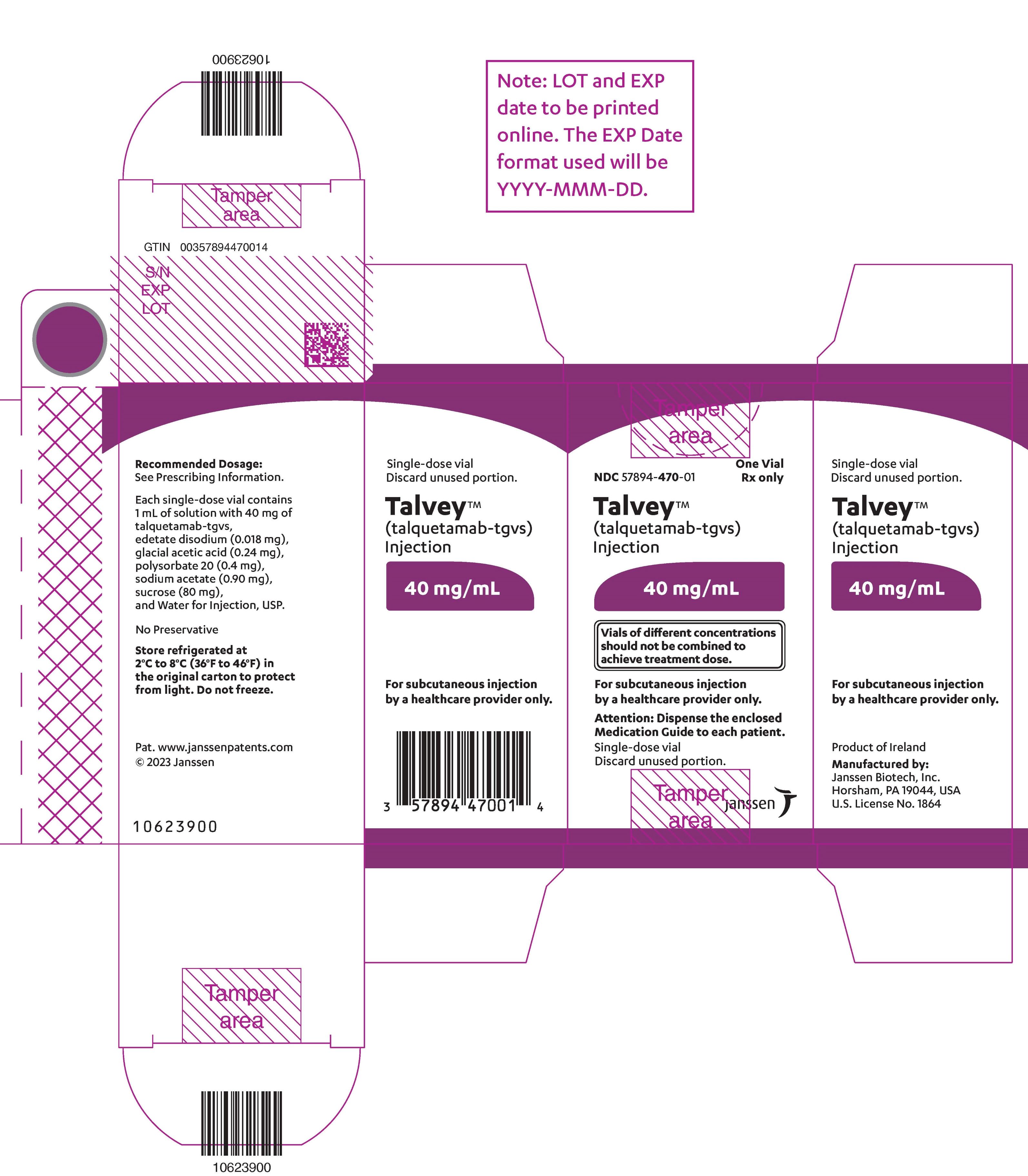 This text provides information about a medication called Talvey™ (talquetamab-tgvs) in the form of an injection. It includes details about the recommended dosage, ingredients, storage instructions, and precautions. The medication is intended for subcutaneous injection by a healthcare provider only. The text also mentions that vials of different concentrations should not be combined and unused portions should be discarded. The product is manufactured by Janssen Biotech, Inc. in the USA.*