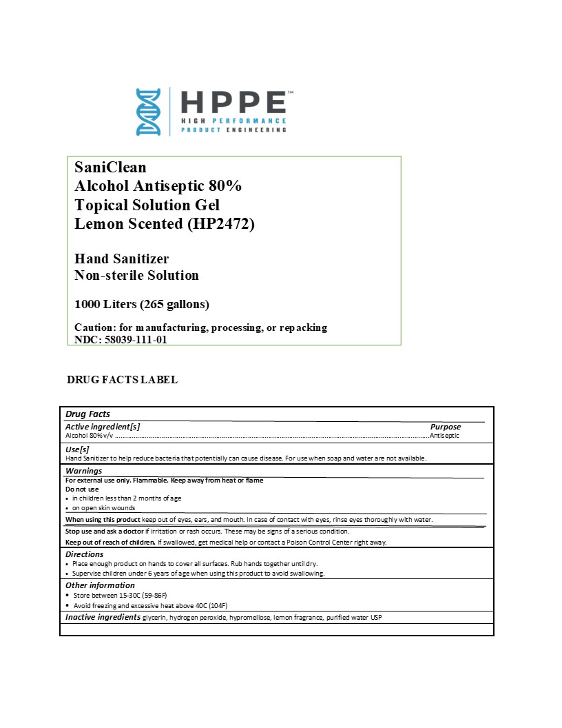 The following image provide visual information about the product associated with Saniclean Alcohol Antiseptic 80% Topical Solution Gel, Lemon Scented (hp2472) NDC 58039-111 by Hppe, Llc, such as packaging, labeling, and the appearance of the drug itself. This resource could be helpful for medical professionals, pharmacists, and patients seeking to verify medication information and ensure they have the correct product.