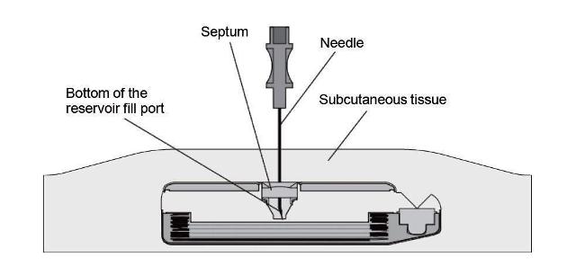 This appears to be a technical diagram or image labeling different parts of a medical device. The labeled parts include a septum, needle, subcutaneous tissue, and a reservoir fill port. Without additional context or information, it is not possible to determine what specific medical device this pertains to or how it functions.*