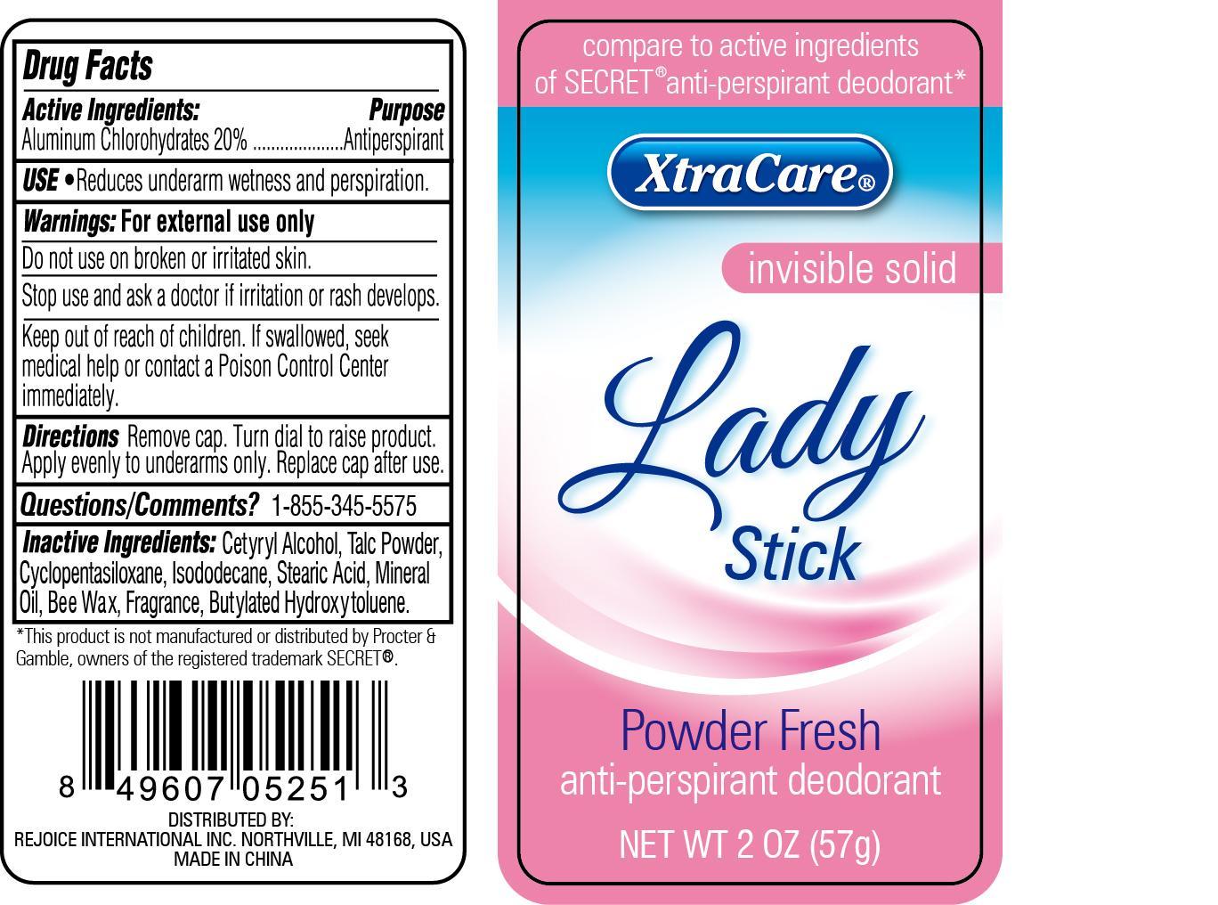 The following image provide visual information about the product associated with Xtracare Invisible Solid Lady Stick Powder Fresh NDC 58503-042 by China Ningbo Shangge Cosmetic Technology Corp., such as packaging, labeling, and the appearance of the drug itself. This resource could be helpful for medical professionals, pharmacists, and patients seeking to verify medication information and ensure they have the correct product.