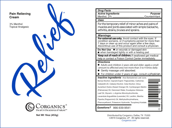 This is a Drug Facts label of a pain relief cream from Corganics with 4% menthol as its active ingredient for temporary relief of minor aches and pains associated with simple backache, arthritis, strains, bruises, and sprains. It provides directions for use, warnings, and precautions. The label also contains the distributor's information and a customer care number.*