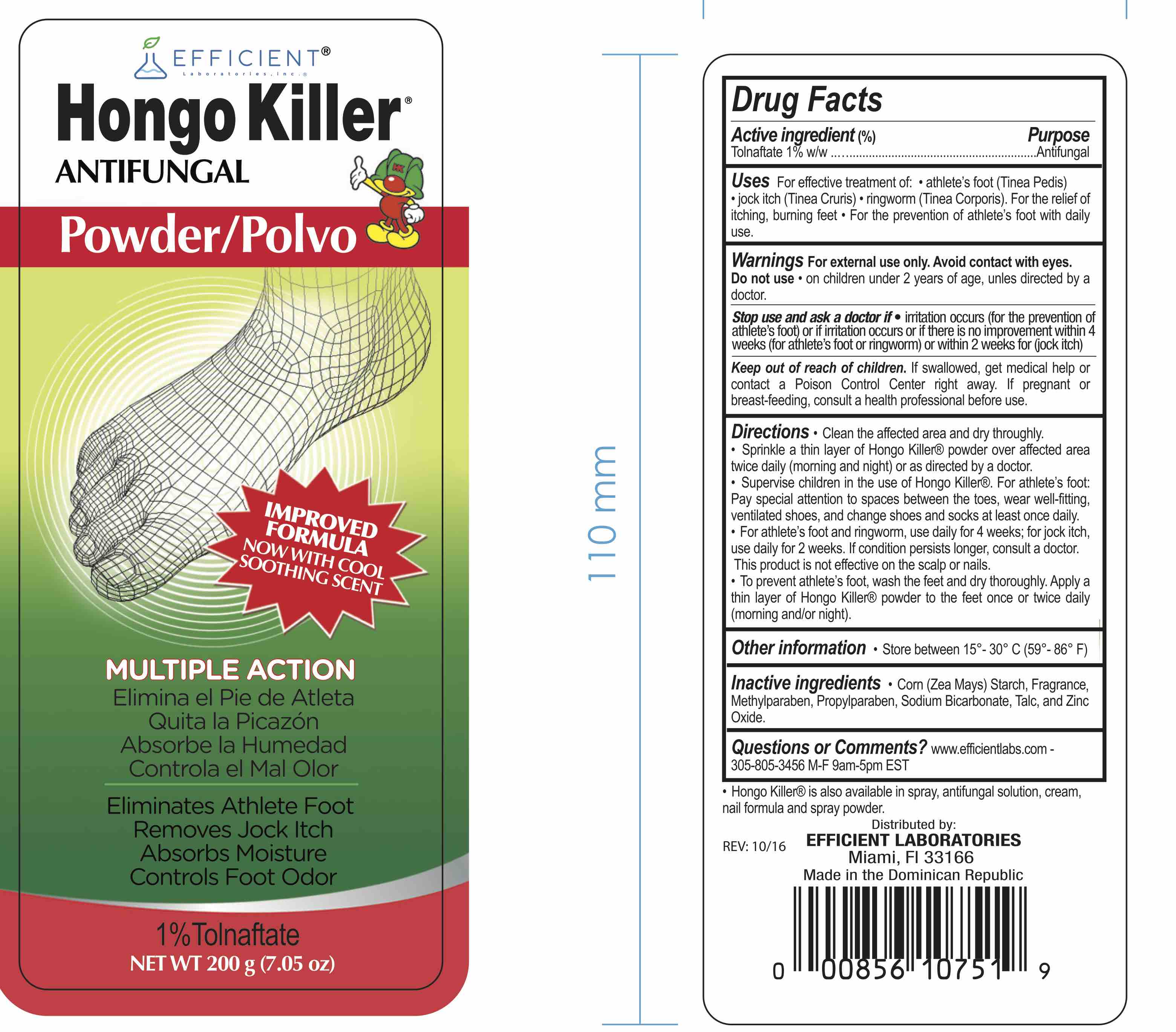 Hongo Killer is an antifungal product that effectively treats athlete's foot, jock itch, and ringworm. It relieves itching and burning and prevents athlete's foot with daily use. It contains 1% tolnaftate as the active ingredient and is for external use only. The directions advise cleaning and drying the affected area before applying the powder twice a day for two to four weeks. The product is not effective on the scalp or nails, and children under two years old should not use it. The inactive component of the product is a mixture of Corn Starch, Methylparaben, Propylparaben, Sodium Bicarbonate, Talc, and Zinc Oxide. In case of irritation, a doctor must be consulted. The product is distributed by Efficient Laboratories and manufactured in the Dominican Republic in 90g packaging.*