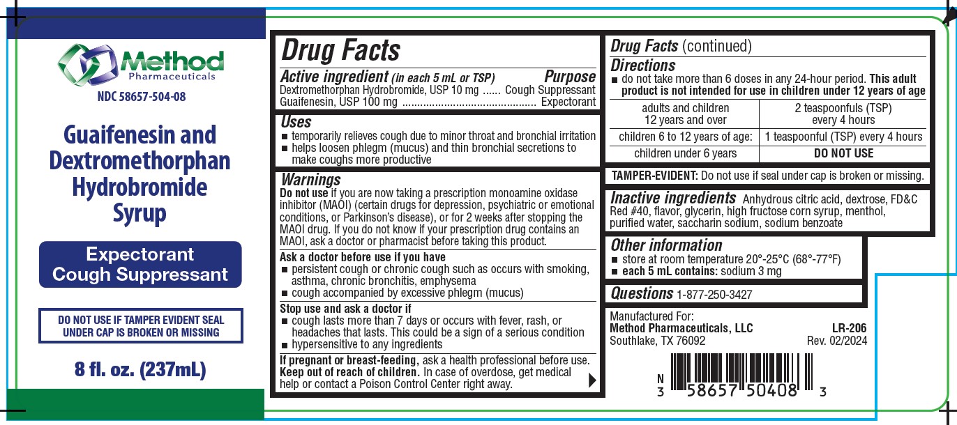 The following image provide visual information about the product associated with Guaifenesin And Dextromethorphan Hydrobromide NDC 58657-504 by Method Pharmaceuticals, such as packaging, labeling, and the appearance of the drug itself. This resource could be helpful for medical professionals, pharmacists, and patients seeking to verify medication information and ensure they have the correct product.