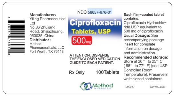 This is a description of a medicine with the NDC code 58657-676-50. It is a film-coated tablet manufactured by Yiling Pharmaceutical in China. Each tablet contains 500 mg of ciprofloxacin hydrochloride USP equivalent to No.36 Zhujiang. The recommended dosage and administration information can be found in the accompanying package insert. The medication guide must be dispensed separately to each patient. The medicine should be stored in controlled room temperature in well-closed containers.*