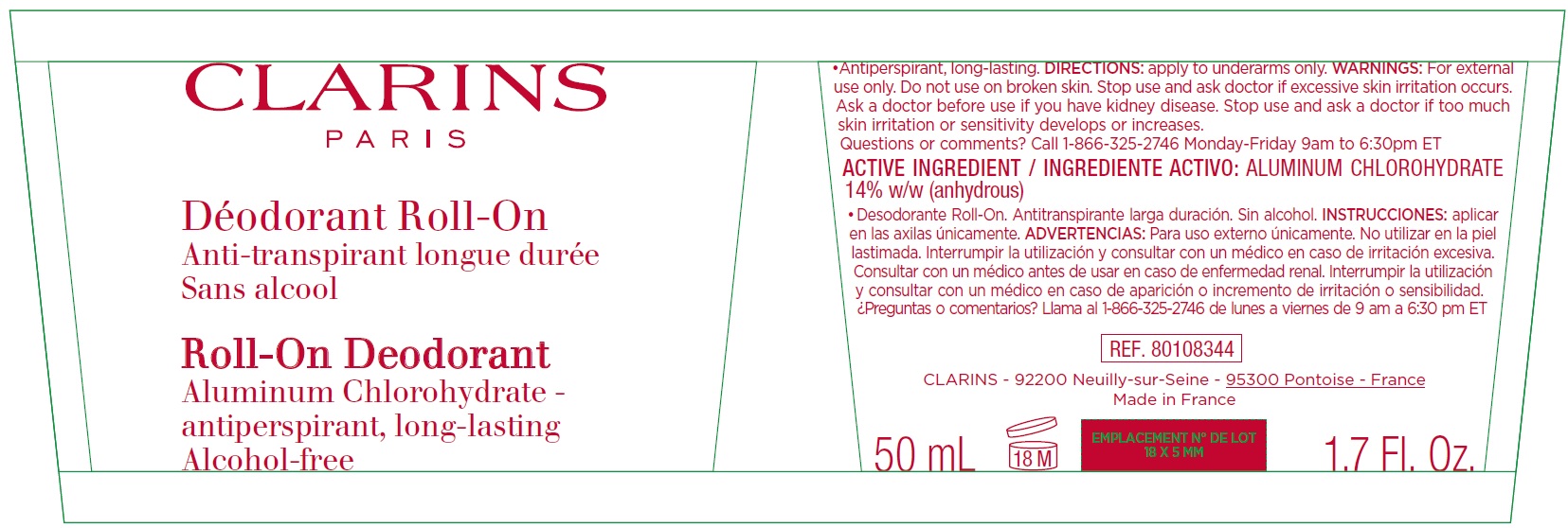 This is a description of a Clarins Paris Deodorant Roll-On, an anti-perspirant with long-lasting effects and alcohol-free formula. It contains Aluminum Chlorohydrate as the active ingredient. The directions suggest applying it to underarms only, with warnings to avoid using on broken skin and to consult a doctor in case of excessive skin irritation or sensitivity. The product is made in France and the customer service contact number is provided for any questions or comments.*