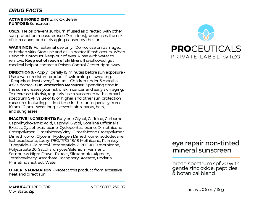 The following image provide visual information about the product associated with Proceuticals Private Label By Tizo Eye Repair Non-tinted Mineral Sunscreen NDC 58892-236 by Fallien Cosmeceuticals, Ltd, such as packaging, labeling, and the appearance of the drug itself. This resource could be helpful for medical professionals, pharmacists, and patients seeking to verify medication information and ensure they have the correct product.