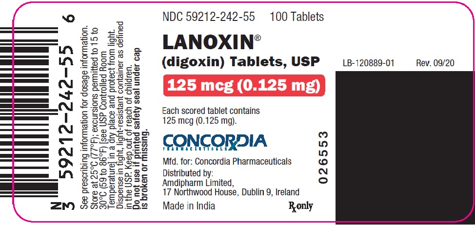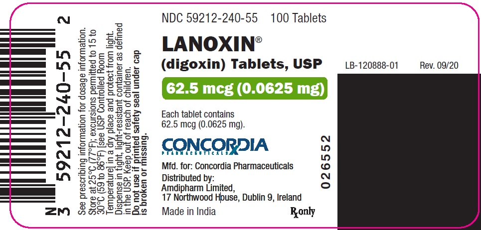 LANOXIN (digoxin) is a drug that comes in a bottle of 100 tablets manufactured by Amdipharm Limited, India. Each tablet contains digoxin, which is used to treat heart disease by improving heart function and controlling the rate and rhythm of heartbeat. The distributor of this drug is not clear, but the manufacturer is Mfd. for Concordia Pharmaceuticals in Dublin, Ireland. The NDC code for this drug is NDC 50212-240-55. The remaining text appears to be random characters and symbols that do not provide any meaningful information.*