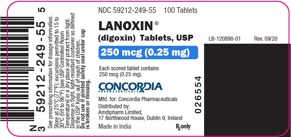 This text refers to the details of a medication called "Digoxin" in the form of 100 tablets, each containing 250 mcg (0.25 mg). The manufacturer of the medication is Concordia Pharmaceuticals based in Dublin and it is distributed by Concordia. The NDC code for the medication is 50212-249-55 and the product is called "LANOXIN". The remaining text seems to be irrelevant and contains some gibberish.*
