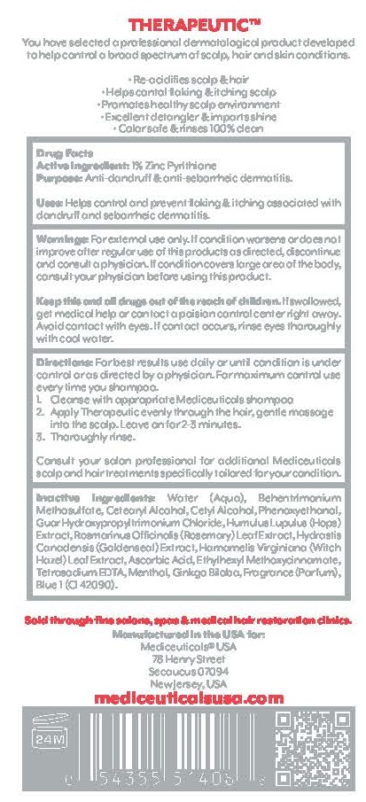 This appears to be a product description for a therapeutic dermatological product called Therapeutic. It is designed to help control a broad range of scalp, hair, and skin conditions. The product claims to re-occurify the scalp and help control flaking and itching, promote a healthy scalp environment, and act as an excellent detangler and shine enhancer. It includes an Active Ingredient, Zinc Pyrithione, and provides warnings for external use, avoiding contact with eyes and seeking medical attention if necessary. The directions suggest using the product daily or as directed by a physician. However, it does not appear to provide information on what type of scalp, hair, or skin conditions it is best suited for.*