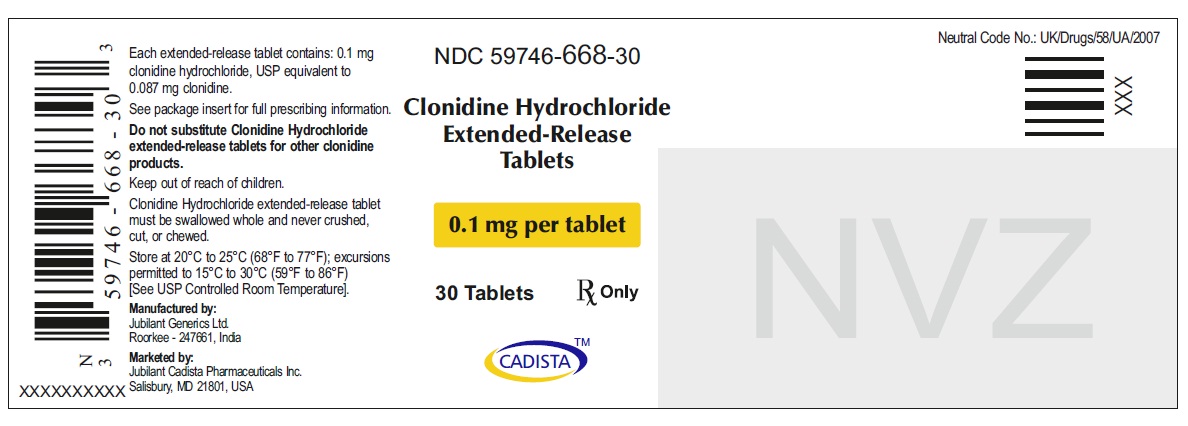 The text appears to be a description of a medication called Clonidine Hydrochloride that comes in the form of extended-release tablets. Each tablet contains 0.1 mg (NDC 59746-668-30) of Clonidine Hydrochloride, USP equivalent to 0.087 mg Choridine. It is mentioned not to substitute this extended-release tablet with other clonidine extended-release products. The tablets must be swallowed whole and not crushed. It is instructed to refer to the package insert for prescribing information. The medication should be kept away from children and should be stored at temperatures ranging from 20°C to 25°C (66°F to 77°F). It is manufactured by Jubilant Generics Ltd in India and marketed by Cadista, a pharmaceutical company based in Salisburg, USA.*