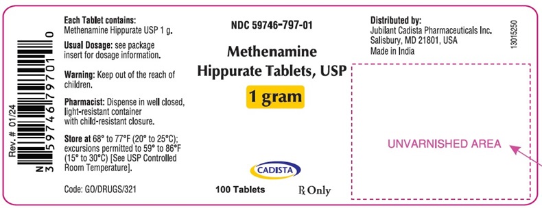 The following 2 images provide visual information about the product associated with Methenamine Hippurate NDC 59746-797 by Jubilant Cadista Pharmaceuticals Inc., such as packaging, labeling, and the appearance of the drug itself. This resource could be helpful for medical professionals, pharmacists, and patients seeking to verify medication information and ensure they have the correct product.