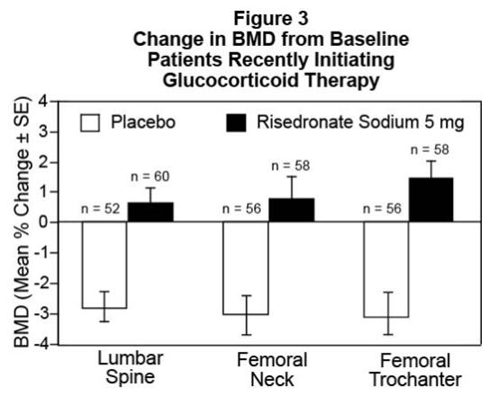 The prevention study enrolled 228 patients (Risedronate Sodium 5 mg, N = 76) (18 to 85 years of age), each of whom had initiated glucocorticoid therapy (mean daily dose of prednisone 21 mg) within the previous 3 months (mean duration of use prior to study 1.8 months) for rheumatic, skin, and pulmonary diseases. The mean lumbar spine BMD was normal at baseline (average T-score -0.7). All patients in this study received supplemental calcium 500 mg/day. By the third month of treatment, and continuing through the year-long treatment, the placebo group experienced losses in BMD at the lumbar spine, femoral neck, and trochanter, while BMD was maintained or increased in the Risedronate Sodium 5 mg group. At each skeletal site there were statistically significant differences between the placebo group and the Risedronate Sodium 5 mg group at all timepoints (Months 3, 6, 9, and 12). The treatment differences increased with continued treatment. Although BMD increased at the distal radius in the Risedronate Sodium 5 mg group compared to the placebo group, the difference was not statistically significant. The differences between placebo and Risedronate Sodium 5 mg after 1 year were 3.8% at the lumbar spine, 4.1% at the femoral neck, and 4.6% at the trochanter, as shown in Figure 3. The results at these skeletal sites were similar to the overall results when the subgroups of men and postmenopausal women, but not premenopausal women, were analyzed separately. Risedronate Sodium was effective at the lumbar spine, femoral neck, and trochanter regardless of age (less than 65 vs. greater than or equal to 65), gender, prior and concomitant glucocorticoid dose, or baseline BMD. Positive treatment effects were also observed in patients taking glucocorticoids for a broad range of rheumatologic disorders, the most common of which were rheumatoid arthritis, temporal arteritis, and polymyalgia rheumatica.