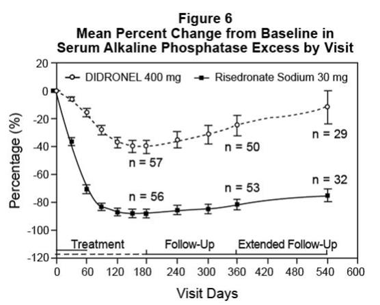 During the first 180 days of the active-controlled study, 85% (51/60) of Risedronate Sodium-treated patients demonstrated a greater than or equal to 75% reduction from baseline in serum alkaline phosphatase excess (difference between measured level and midpoint of the normal range) with 2 months of treatment compared to 20% (12/60) in the Didronel-treated group with 6 months of treatment (p less than 0.001). Changes in serum alkaline phosphatase excess over time (shown in Figure 6) were significant following only 30 days of treatment, with a 36% reduction in serum alkaline phosphatase excess at that time compared to only a 6% reduction seen with Didronel treatment at the same time point (p less than 0.01).