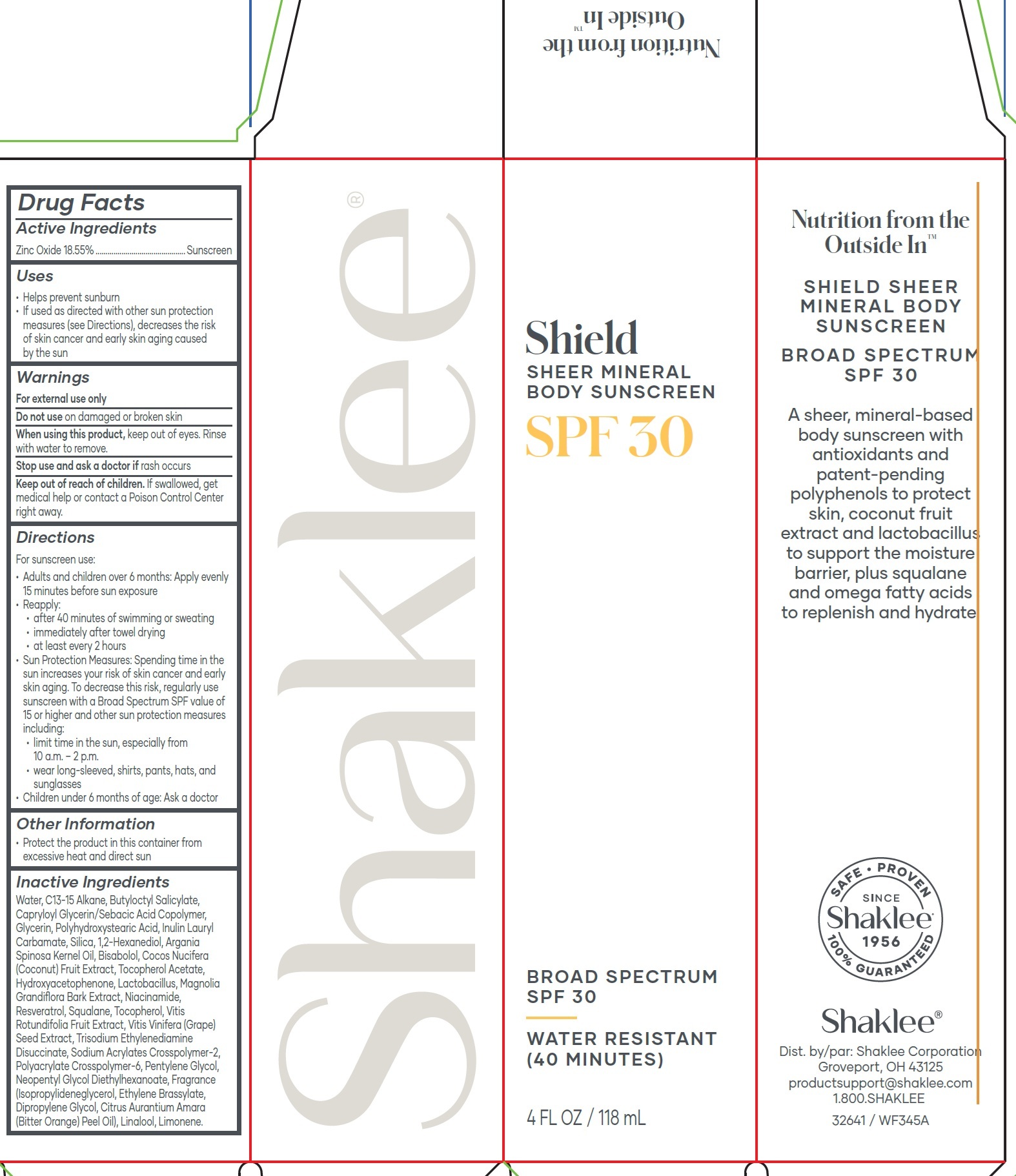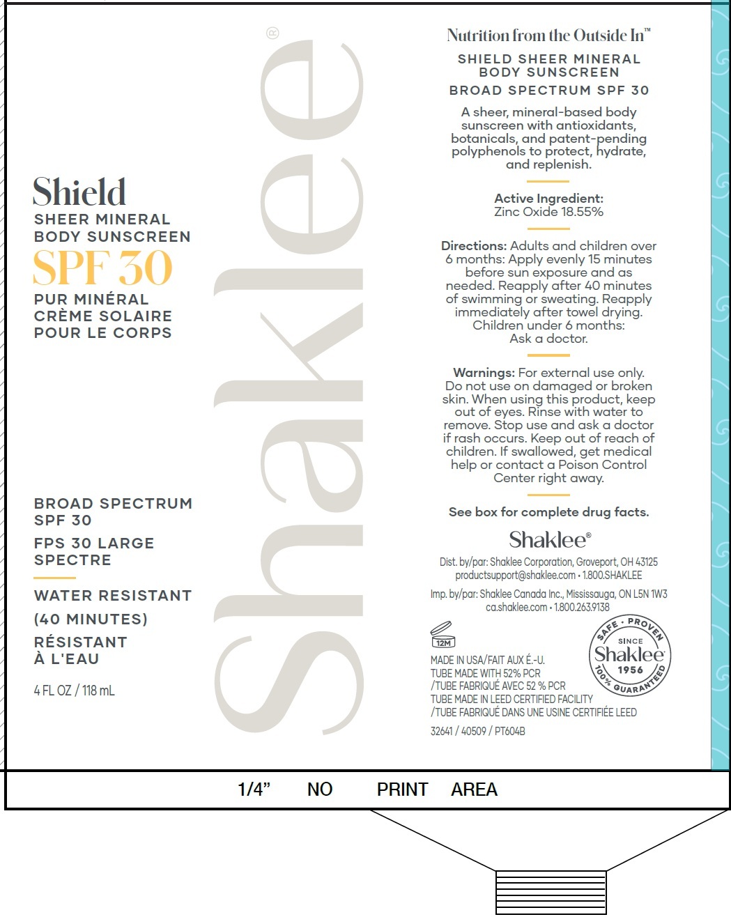 This text provides information on a Sheer Mineral Body Sunscreen with a Broad Spectrum SPF 30. The sunscreen contains antioxidants, polyphenols, coconut fruit extract, lactobacillus, squalane, and omega fatty acids to protect and nourish the skin. It includes details on active and inactive ingredients, directions for use, sunscreen reapplication guidelines, and warnings for external use. The product is water-resistant for up to 40 minutes and comes in a 4 fl oz (118 mL) container. For more information, contact Shaklee Corporation.*