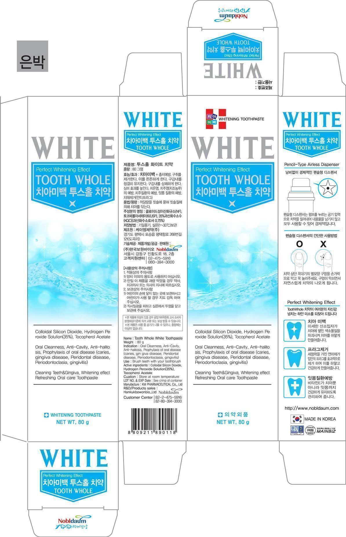 This is a description of a toothpaste product called "Tooth Whole White Toothpaste". It is manufactured by a company called KM Pharmaceutical Co., Ltd. The product comes in an 80g pack and is designed to provide oral cleanness, anti-cavity, anti-halitosis, prophylaxis of oral disease including caries, gingiva disease, peridontal disease, periodontoclasia and gingivitis. The toothpaste is made using colloidal silicon dioxide, hydrogen peroxide solution, tocopheol acetate, and is meant to be stored at room temperature. The product is packaged in a pencil-type airless dispenser, and it is a refreshing oral care toothpaste that also provides a whitening effect.*