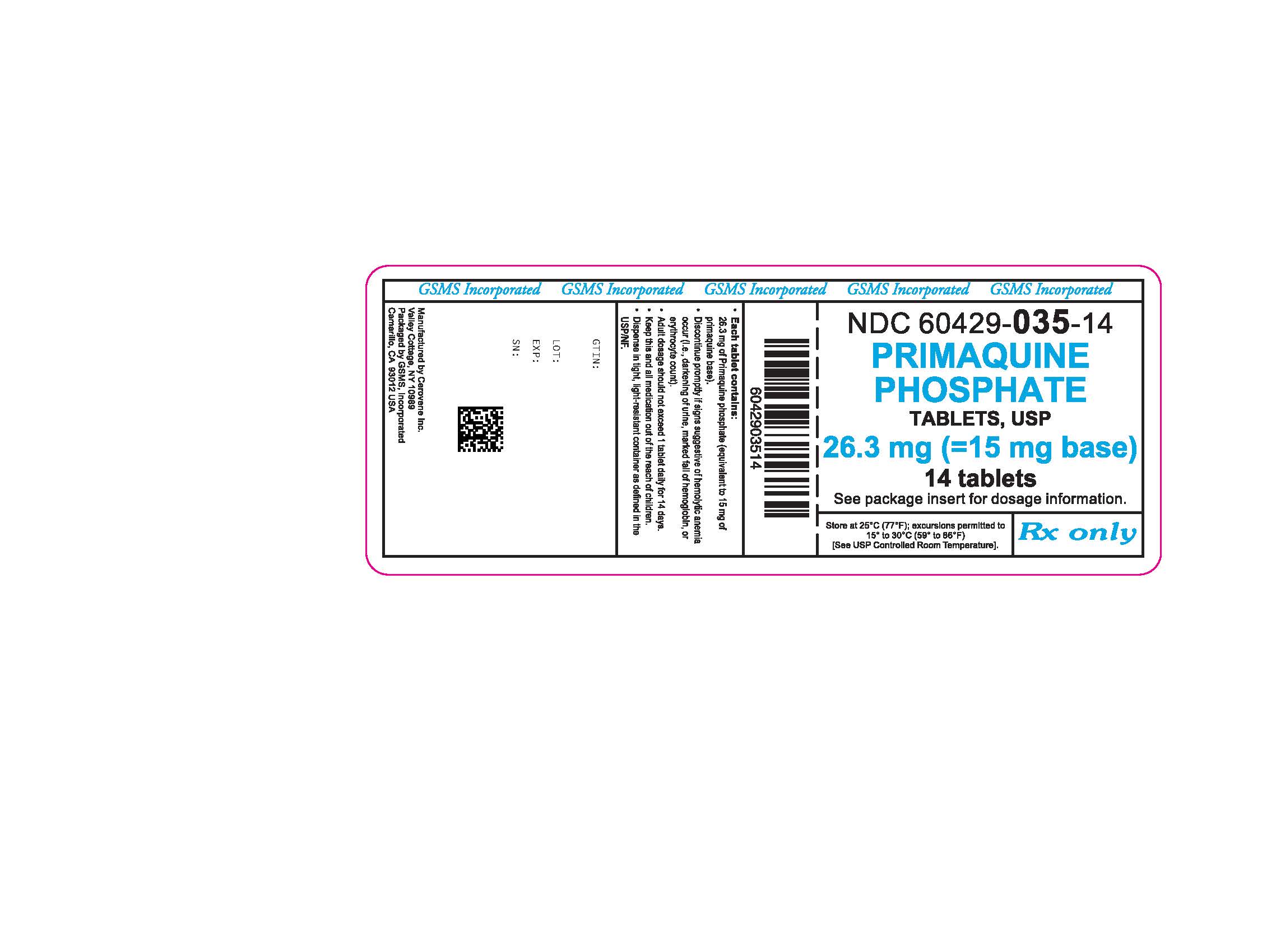 The following image provide visual information about the product associated with Primaquine Phosphate NDC 60429-035 by Golden State Medical Supply, Inc., such as packaging, labeling, and the appearance of the drug itself. This resource could be helpful for medical professionals, pharmacists, and patients seeking to verify medication information and ensure they have the correct product.