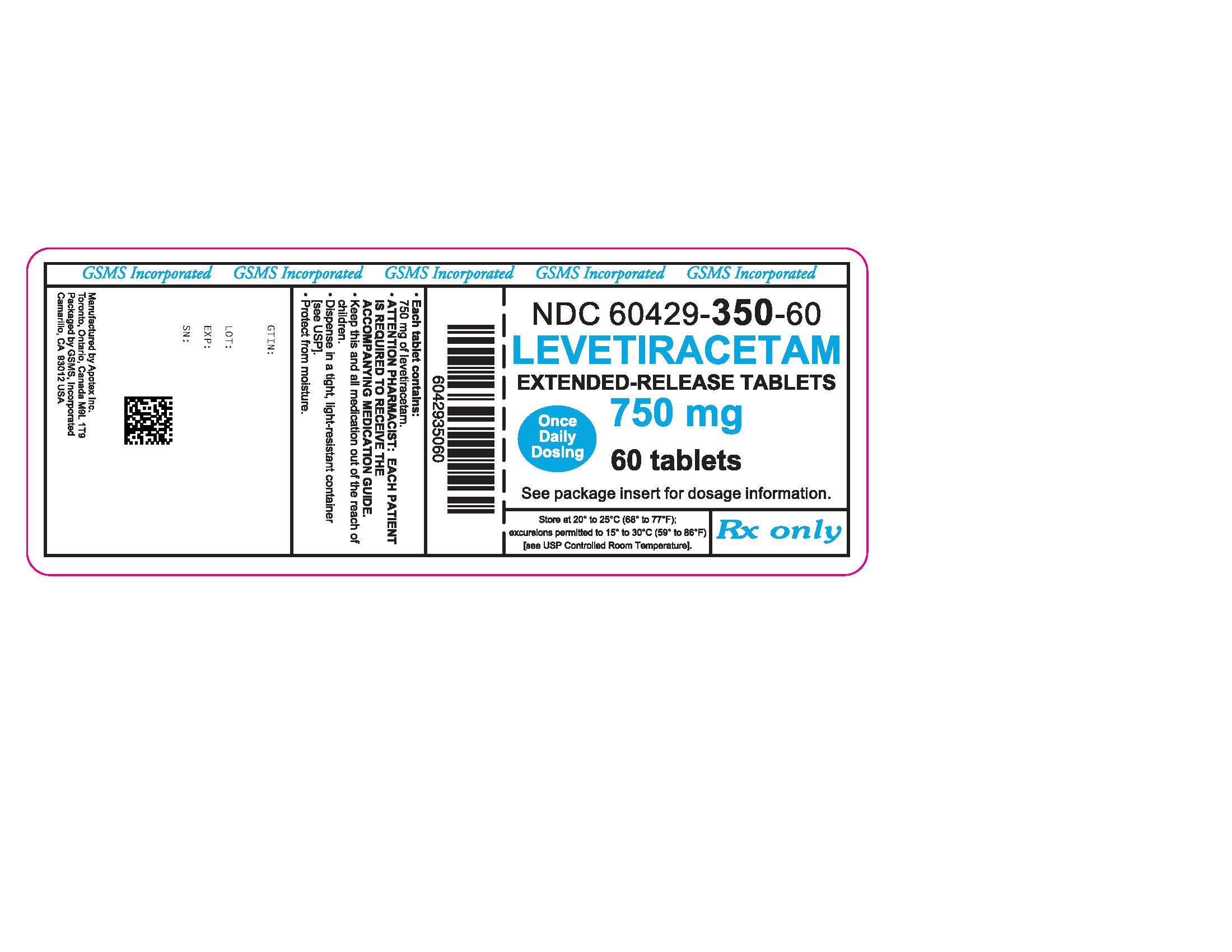 This is a bottle of release tablets that contains 60 tablets. The tablets contain 750mg of levetiracetam. The package comes with dosage information. It should be stored at a temperature of 20°C to 25°C, with permitted excursions to 15°C to 30°C (room temperature). Pharmacists are required to give each patient a medication guide, and dispensing comes in a tight, light-resistant container. It must be kept out of reach of children and protected from moisture. The tablets were manufactured by Apotex Inc, in Toronto, and packaged by GSMS, Inc. There is also some illegible text, which could not be evaluated.*