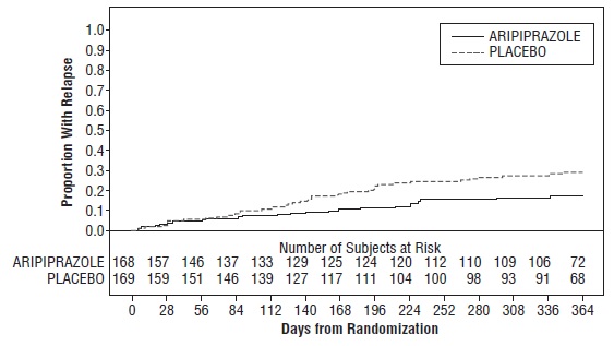 This is a table that compares the proportion of subjects with relapse for Aripiprazole and Placebo. There are also numbers indicating the number of subjects at risk for Aripiprazole and Placebo over a period of 364 days.*