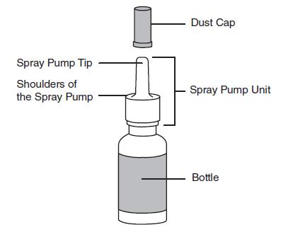 This text describes various components of a spray pump system, including a dust cap, spray pump tip, the shoulders of the spray pump unit, and a bottle. It does not provide further details on the intended use or specifications of these components.*