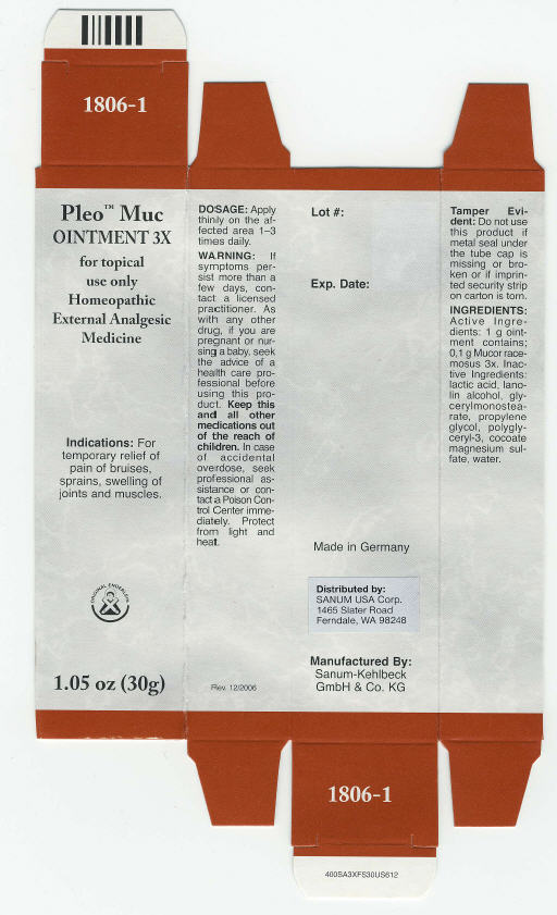 Pleo™ Muc Ointment 3X is a homeopathic external analgesic medicine used topically for temporary relief of pain from bruises, sprains, swelling of joints, and muscles. It should be applied on a focused area once or twice a day. However, if symptoms persist or worsen, it is important to consult a licensed practitioner. The ointment must be kept away from the reach of children, and overdosage must be avoided. It is manufactured in Germany and distributed by SRUM USA Corp, T4 St Ao. Unfortunately, the ingredients are not readable.*