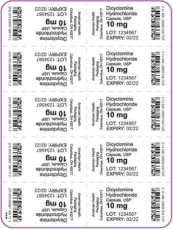 This is a drug package containing 100 capsules of Dicyclomine Hydrochloride, each capsule containing 10mg of the drug substance. The drug is prescribed and should not be taken without a proper prescription or consultation with a doctor. The package should be kept away from children and stored within permitted temperatures. The package was distributed by American Health Packaging, located in Columbus, Ohio. NDC 60687-369-01.*